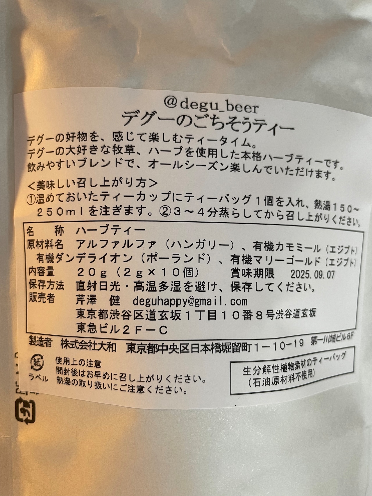 デグーとビールをこよなく愛するインスタグラム「デグーとビール」をお送りしているデグーお世話係(がんもパパと呼ばれます)と、東京日本橋のハーブティーメーカー、なごみナチュルアが多くの試作を経て共同開発したハーブティーが遂に完成しました!(製造に関しては、なごみナチュルア(株式会社大和)様より、製造からパッケージングまで行っております。)